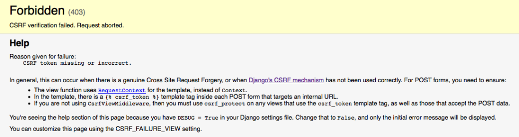A présent, si vous soumettez le formulaire de recherche, Django vous gratifiera d'une erreur 403 Forbidden ; il a même la gentillesse de vous indiquer la marche à suivre, en trois points :